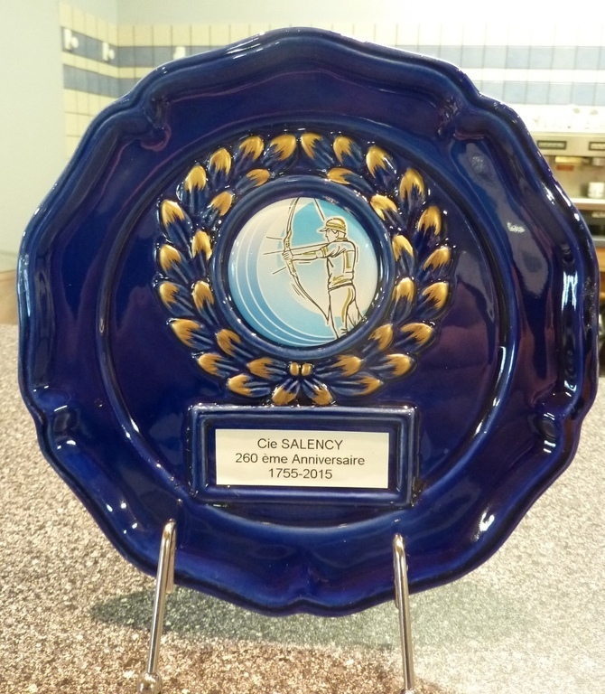 Dimanche 28 juin 2015, la Compagnie d'Arc de Salency avait invité les compagnies de la ronde et le club de Saint Quentin pour la messe anniversaire des 260 ans de la compagnie de Salency. Catherine et Georges ont fait le déplacement afin de présenter le drapeau du club. Le club s'est vu remettre une assiette commémorative à cette occasion, assiette qui trône désormais dans la vitrine des trophées du club.