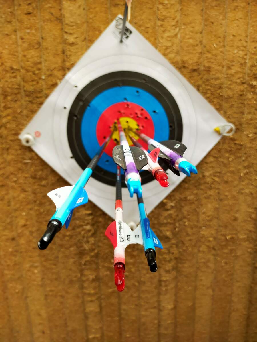 Cette année ajout d'une baguette verticale (touillette à café peinte en orange) devant la cible. C'est Pixou qui se montre impérial en cassant deux baguettes. Les autres archers les encadrent, les frôlent, mais ça ne casse pas. Zut de zut...