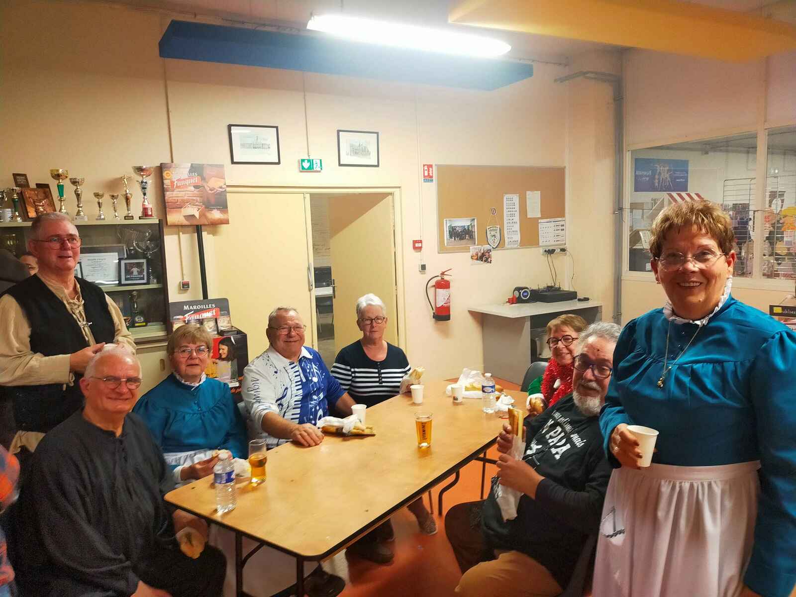 Dimanche soir, aprés le rangement de la salle (un support arc oublié...) Jean Pierre réunissait les bénévoles acteurs de ce weekend pour un debriefing et le pot de l'amitié.