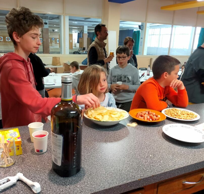 Aprés les deux séries de tir (certains ont un peu mal aux bras, 72 flèches plus les éssais, ça compte...), les archers se regroupent pour la proclamation des résultats. Le pot de l'amitié réuni une dernière fois les archers et leurs familles.