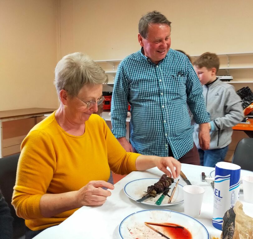 Ceux qui ont décidé de poursuivre cette belle journée se mettent à table aprés avoir profité du BBQ allumé par Christian. Une bonne part de frites et un petit verre pour faire glisser, et Carmen distribue le dessert glacé.