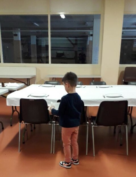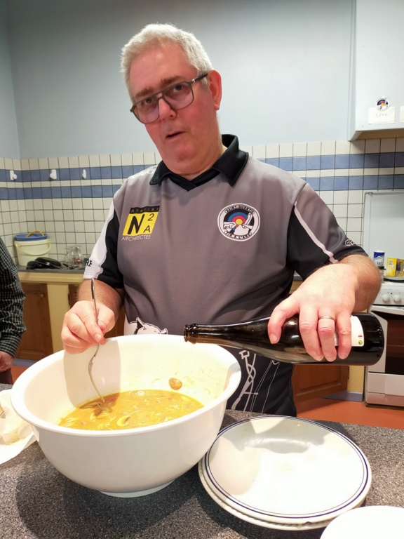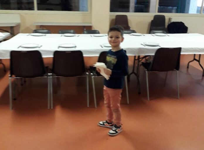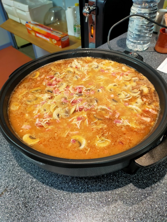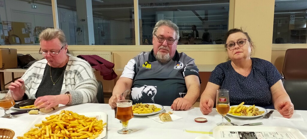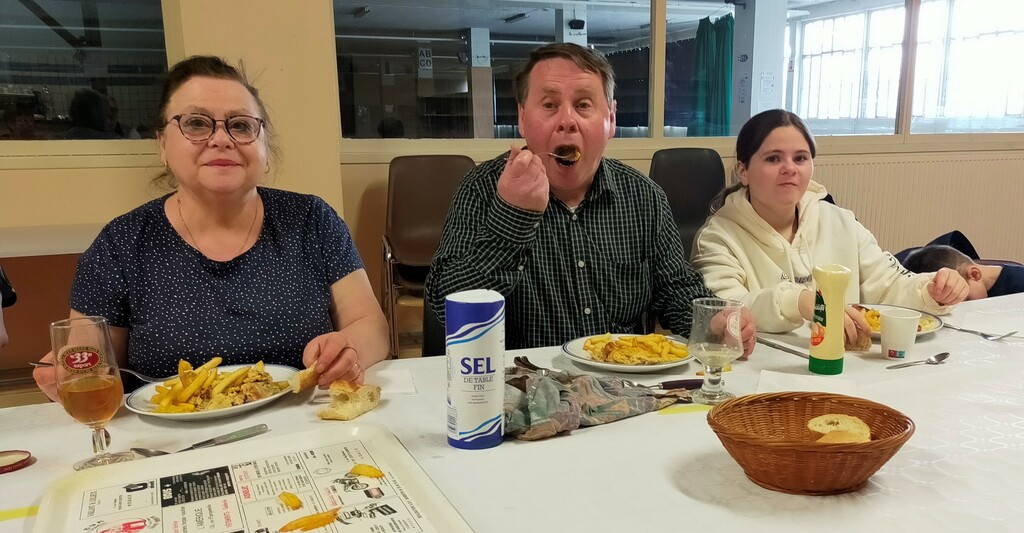 Retour au club ou nous atg tendaient les copains affamés. La table mise, les frites et les tartes aux pommes en cours de cuisson.